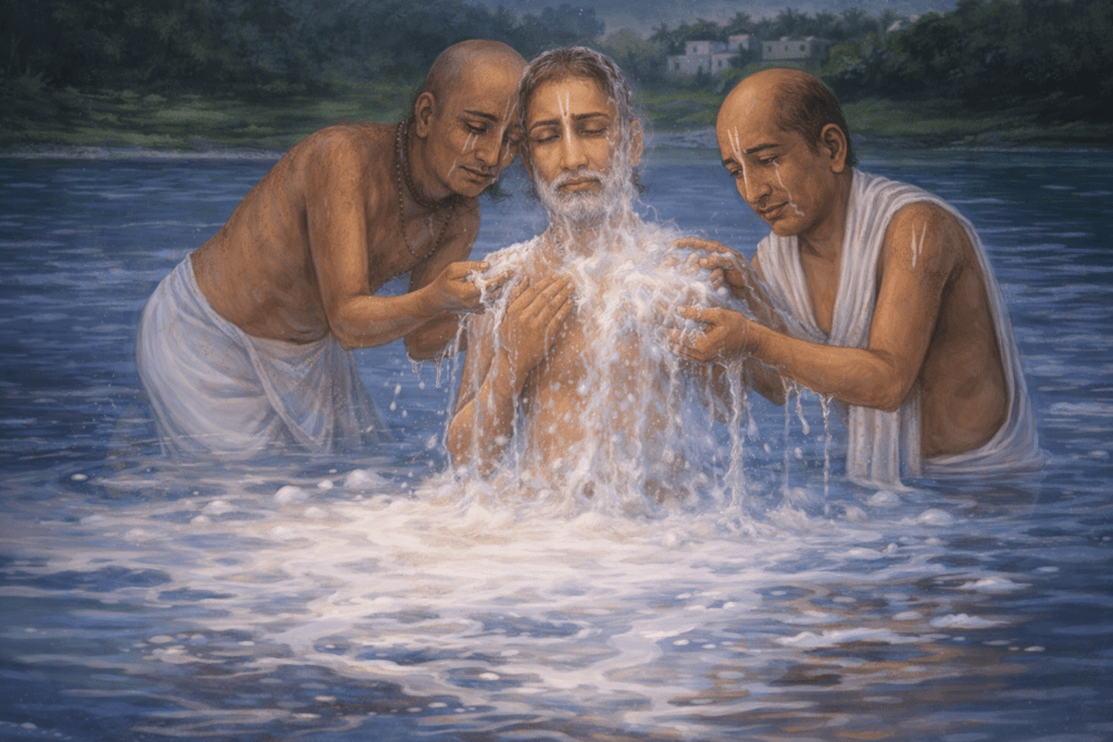 ഇതാണ് സനാതന ധർമ്മം, ശാശ്വത ധർമ്മം, ഇത് മനുഷ്യ ജീവിതത്തെ ഉദ്ദേശിച്ചുള്ളതാണ്. വർണ്ണ സമ്പ്രദായം സമൂഹത്തെ ചിട്ടപ്പെടുത്താനും അത് ആത്മീയ പ്രാരംഭവുമായി യാതൊരു ബന്ധവുമില്ലാത്തതുമാണ്. “ഈ വാക്കുകൾ കേട്ടപ്പോൾ ഗംഗ-നാരായണന്റെ ഹൃദയം മൃദുവായി. ആൺകുട്ടികൾക്ക് ആത്മീയ കാര്യങ്ങളിൽ ഇത്ര ആഴത്തിലുള്ള ധാരണയുണ്ടെന്ന് കണ്ട് അയാൾ അത്ഭുതപ്പെട്ടു. പണ്ഡിതന്റെ സ്വാഭാവിക കൃഷ്ണാവബോധം അവരുടെ സഹവാസത്താൽ ഉണർന്നിരുന്നു, അദ്ദേഹംതാഴ്മയോടെ അവരുടെ ഗുരുവായ ശ്രീല നരോത്തമ ദാസ് താക്കൂറിനെ സമീപിച്ച് ദീക്ഷ സ്വീകരിച്ചു.