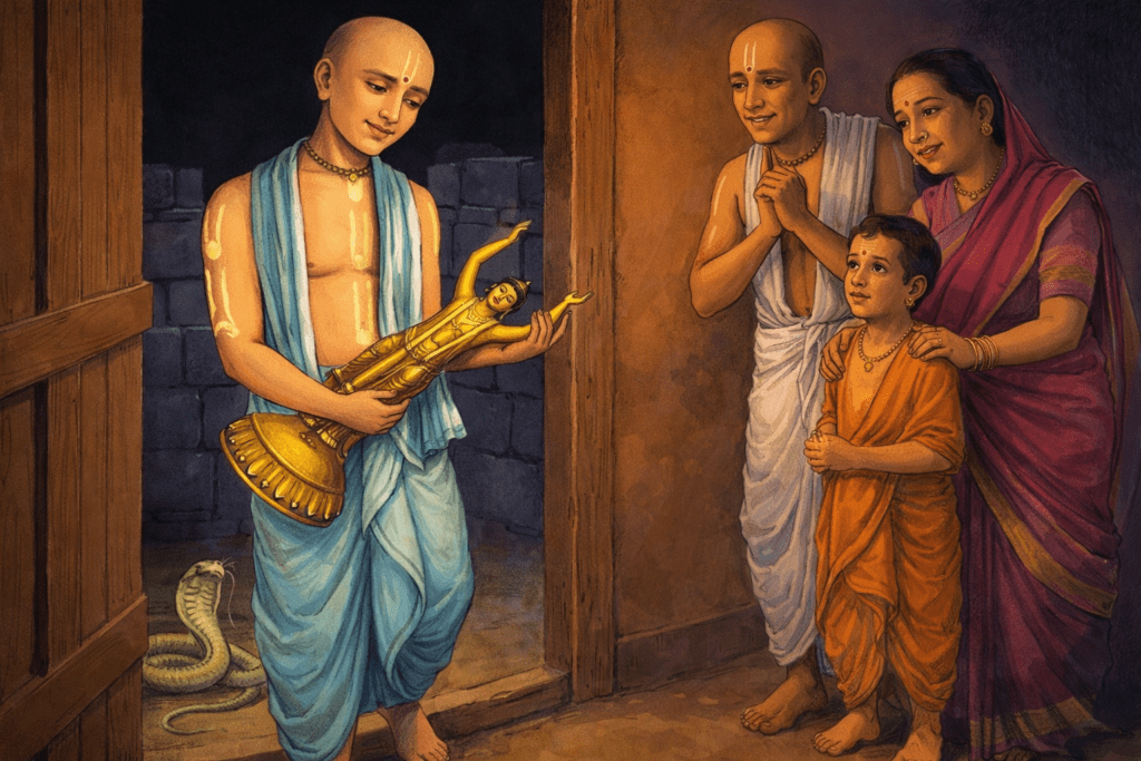 ഒരിക്കൽ യാത്ര ചെയ്യുമ്പോൾ നരോത്തം ഒരു ബ്രാഹ്മണന്റെ വീട്ടിൽ ചെന്നു. ബ്രാഹ്മണൻ തന്റെ കലവറയിൽ ഒരു അപകടകാരിയായ സർപ്പത്തെക്കുറിച്ച് പറഞ്ഞു. “ആരെങ്കിലും അടുക്കുമ്പോൾ ഈ സർപ്പം ഉച്ചത്തിൽ ചീറുന്നു,” അദ്ദേഹം പറഞ്ഞു. ഒന്നും മിണ്ടാതെ നരോത്തം ഉടനെ കലവറയിൽ പ്രവേശിച്ചു. ബ്രാഹ്മണനും കുടുംബവും അതിഥിയുടെ സുരക്ഷയെ ഭയപ്പെട്ടു. ചൈതന്യ മഹാപ്രഭുവിന്റെ മനോഹരമായ ഒരു വിഗ്രഹം കൈവശമാക്കി നരോത്തമ ദാസ താക്കൂർ സുരക്ഷിതമായി പുറത്തേക്കിറങ്ങുന്നത് അവർ സന്തോഷത്തോടെ കണ്ടു. അദ്ദേഹം വിശദീകരിച്ചു, “സർപ്പം വിഗ്രഹത്തെ കാത്തുസൂക്ഷിക്കുകയായിരുന്നു.”