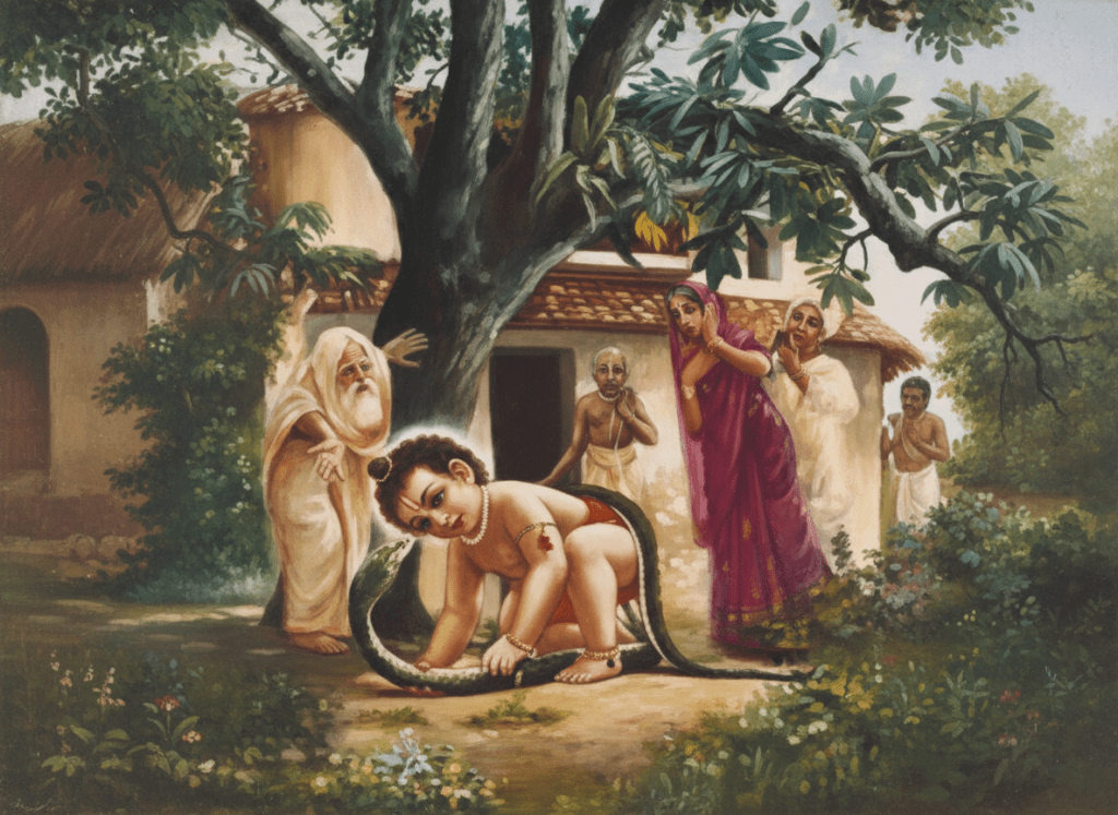 ഒരിക്കൽ മുറ്റത്ത് ഒരു വലിയ സർപ്പത്തോടൊപ്പം കളിക്കുന്ന നിമായിയെ കണ്ട് സചീദേവിയും ജഗന്നാഥ മിശ്രനും ഭയചകിതരായി. എന്തുചെയ്യണമെന്നറിയാതെ അവർ പകച്ചുനിന്നു. എന്നാൽ അല്പസമയത്തിനുശേഷം ആ സർപ്പം ഭഗവാന്റെ ശരീരത്തിലൂടെ ഇഴഞ്ഞുനീങ്ങി യാതൊരു ഉപദ്രവവും ഏൽപ്പിക്കാതെ അവിടെനിന്നും മറഞ്ഞു. സാക്ഷാൽ വിഷ്ണുഭഗവാന്റെ ശയ്യയായ അനന്തശേഷന്റെ തന്നെയാണ് സർപ്പരൂപത്തിൽ ഭഗവാനെ സേവിക്കാൻ എത്തിയതെന്ന് അവർ അറിഞ്ഞില്ല.