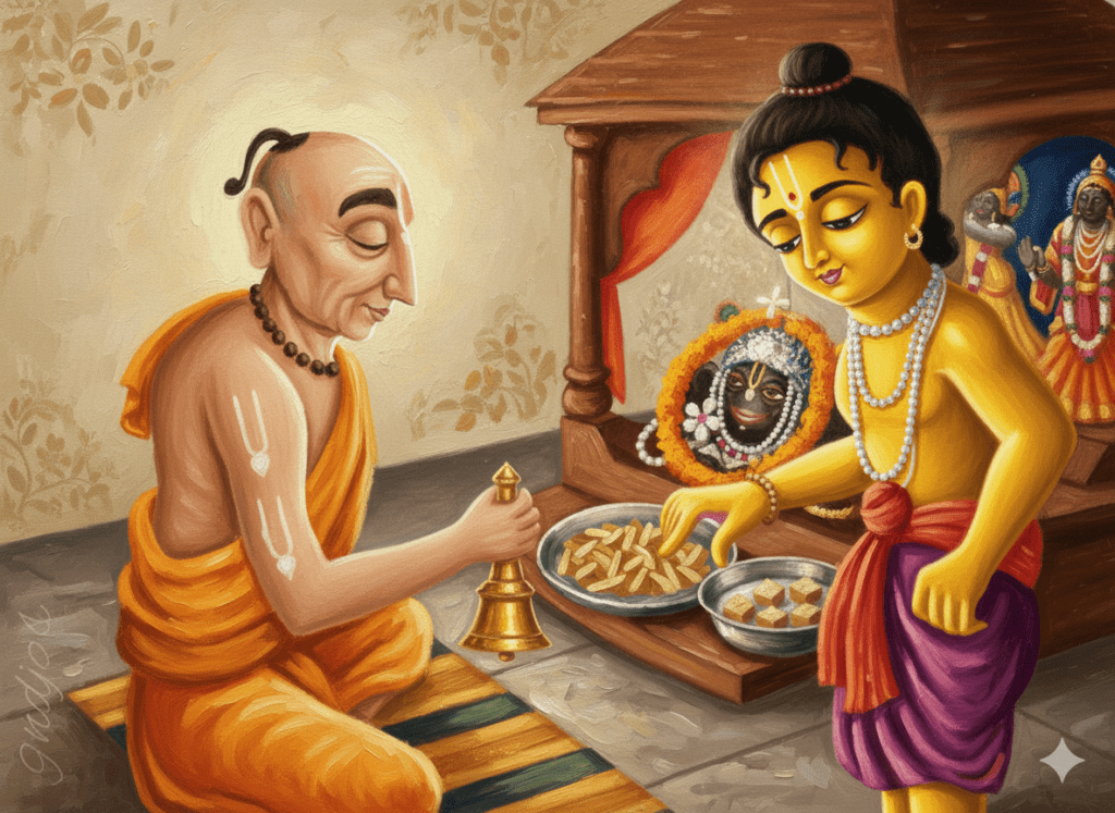 ബംഗാളിലെ ഗംഗാതീരത്ത് സ്ഥിതി ചെയ്യുന്ന നവദീപം അക്കാലത്ത് പണ്ഡിതന്മാരുടെ കേന്ദ്രമായിരുന്നു. അവിടെ വൈഷ്ണവ സമൂഹത്തിന്റെ നേതാവായിരുന്ന ശ്രീ അദ്വൈത ആചാര്യർ, കലിയുഗത്തിലെ ദുരിതങ്ങളിൽ നിന്ന് ജനങ്ങളെ മോചിപ്പിക്കാൻ ഭഗവാൻ കൃഷ്ണൻ വീണ്ടും അവതരിക്കണമെന്ന് ആഗ്രഹിച്ചു. ആ ലക്ഷ്യത്തിനായി അദ്ദേഹം ഗംഗാജലവും തുളസിദളങ്ങളും അർപ്പിച്ചുകൊണ്ട് ഭഗവാനെ ഭക്തിപൂർവ്വം ആരാധിച്ചു.