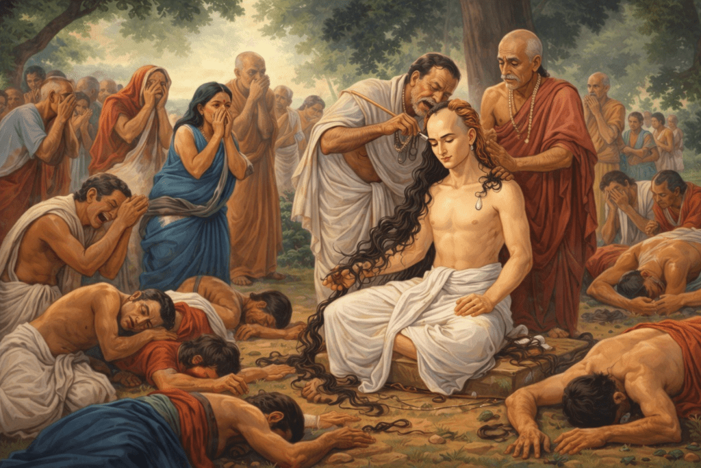 സന്ന്യാസം സ്വീകരിക്കുന്നതിന്റെ ഭാഗമായി നിമായിയുടെ ശിരസ്സ് മുണ്ഡനം ചെയ്യേണ്ടതുണ്ടായിരുന്നു. നിമായിയുടെ സുന്ദരവും തഴച്ചുവളർന്നതുമായ ആ കറുത്ത ചുരുൾമുടികൾ നീക്കം ചെയ്യുന്നത് കണ്ട് കണ്ടുനിന്നവരൊക്കെയും വിങ്ങിപ്പൊട്ടി. ആ ക്ഷൗരക്കാരൻ പോലും കണ്ണുനീർ വാർത്തുകൊണ്ടാണ് തന്റെ ജോലി ചെയ്തത്. എന്നാൽ ഗൗരാംഗപ്രഭു തന്റെ നിശ്ചയത്തിൽ ഉറച്ചുനിന്നു. “മറ്റുള്ളവരിൽ കൃഷ്ണബോധം ഉണർത്താൻ പ്രാപ്തിയുള്ളവൻ” എന്നർത്ഥം വരുന്ന ശ്രീ കൃഷ്ണ ചൈതന്യ എന്ന സന്ന്യാസ നാമം കേശവ ഭാരതി അദ്ദേഹത്തിന് നൽകി. തുടർന്ന്, ഭക്തിലഹരിയിൽ ആമഗ്നനായ ശ്രീ കൃഷ്ണ ചൈതന്യ മഹാപ്രഭു ഉടൻതന്നെ വൃന്ദാവനത്തെ ലക്ഷ്യമാക്കി യാത്ര തിരിച്ചു.