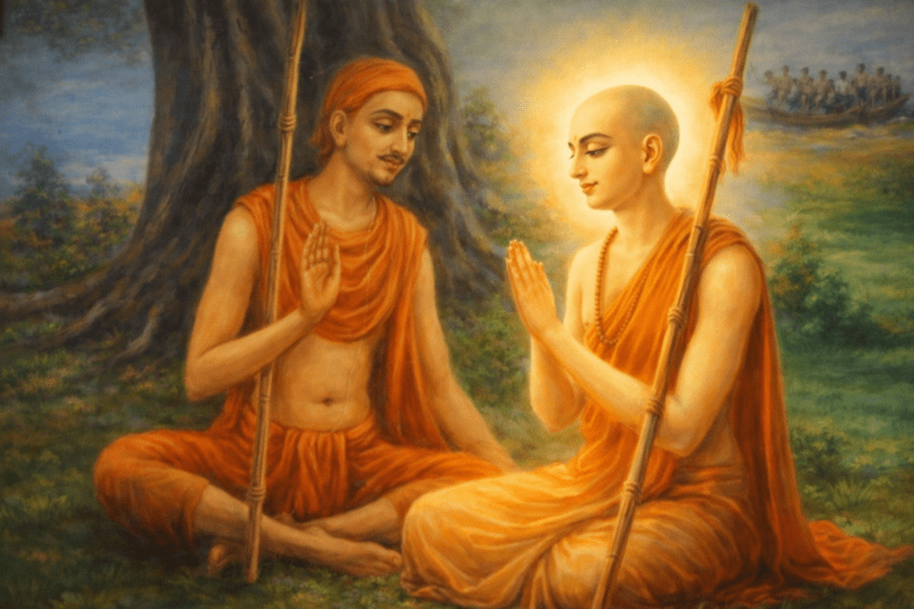 ഇരുവരും നദിക്കരയിലേക്ക് നടന്നു നീങ്ങവെ, അദ്വൈത ആചാര്യർ ഒരു നൗകയിൽ എതിർവശത്തുനിന്നും വരുന്നത് അവർ കണ്ടു. അല്പം സംശയത്തോടെ ഭഗവാൻ ചൈതന്യൻ ചോദിച്ചു, “അദ്വൈത ആചാര്യർ എങ്ങനെ ഇവിടെ എത്തി? അദ്ദേഹം ശാന്തിപുരിലല്ലേ വസിക്കുന്നത്? അങ്ങ് എന്നെ വഞ്ചിക്കുകയായിരുന്നു എന്ന് ഞാൻ കരുതുന്നു. ഇത് യമുനയല്ല, നാം ഇപ്പോൾ വൃന്ദാവനത്തിലുമല്ല.” അപ്പോൾ അദ്വൈത ആചാര്യർ ഭക്തിപൂർവ്വം ഇപ്രകാരം പ്രത്യുത്തരം നൽകി: “അല്ലയോ പരമേശ്വരാ, അവിടുന്ന് അവിടുത്തെ ഹൃദയത്തിൽ വൃന്ദാവനത്തെ വഹിക്കുന്നതിനാൽ അവിടുന്ന് എവിടെയാണോ, അത് തന്നെയാണ് വൃന്ദാവനം.”