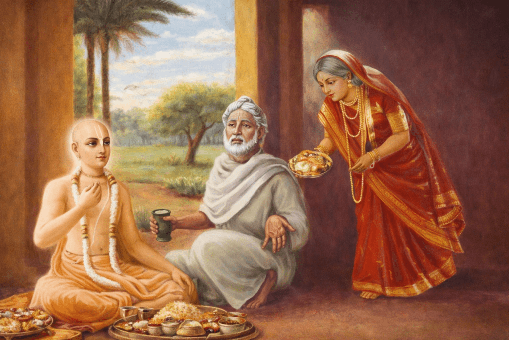 “കൃഷ്ണവിരഹത്താൽ എന്റെ ഹൃദയം വിങ്ങുകയാണ്. മാതാവേ, അങ്ങയുടെ പാദങ്ങളിൽ പ്രണമിച്ച് ഞാൻ അപേക്ഷിക്കുന്നു; ജന്മനാ അങ്ങ് എന്നോട് കാണിച്ച വാത്സല്യം അപാരമാണ്. എന്റെ മുക്തി അങ്ങയുടെയും മുക്തിക്ക് കാരണമാകും. അതിനാൽ എന്നോടുള്ള ഈ ഐഹികമായ മമത വെടിഞ്ഞ് ഭഗവാന്റെ പാദപത്മങ്ങളെ സേവിക്കൂ. കൃഷ്ണപ്രേമം സിദ്ധിക്കുവാനായി എനിക്ക് സന്ന്യാസം സ്വീകരിച്ചേ മതിയാകൂ.”